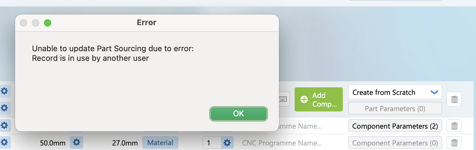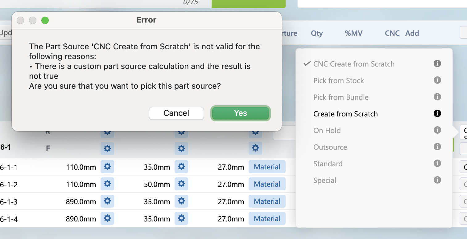 If a user tries to pick a Part Source that is not valid they are shown a dialogue with the reason it is not valid. They can choose to change it anyway or click ‘Cancel’ to revert the change.