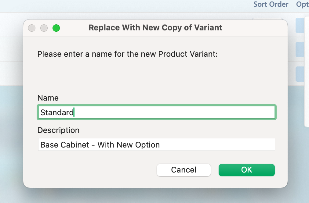 The user will then be prompted to enter a new Name and Description. The system will then duplicate the Product Variant including the links to Parts, Custom Values, Manufacture Parameters, Material Variants and Pricing Calculations.
