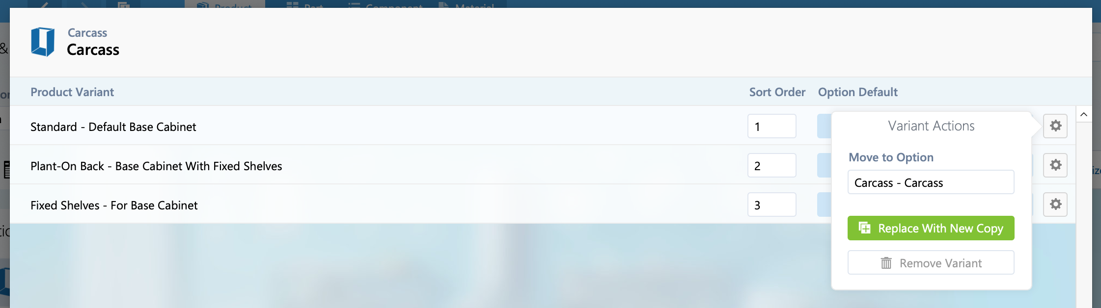 It’s also now possible to make a new copy of a Product Variant and replace the existing variant on a Product in a single step. Open the Variant card windo by clicking ‘Edit Variant’. Click the ‘Cog’ icon for the variant you want to replace, then click ‘Replace With New Copy’.
