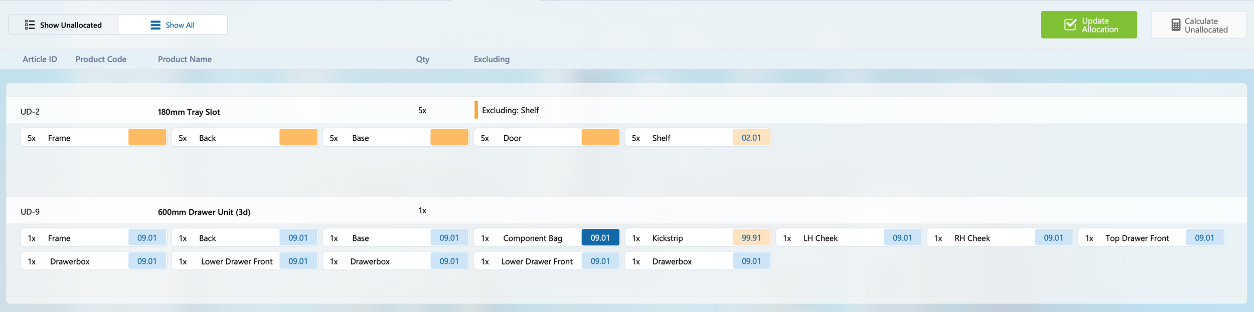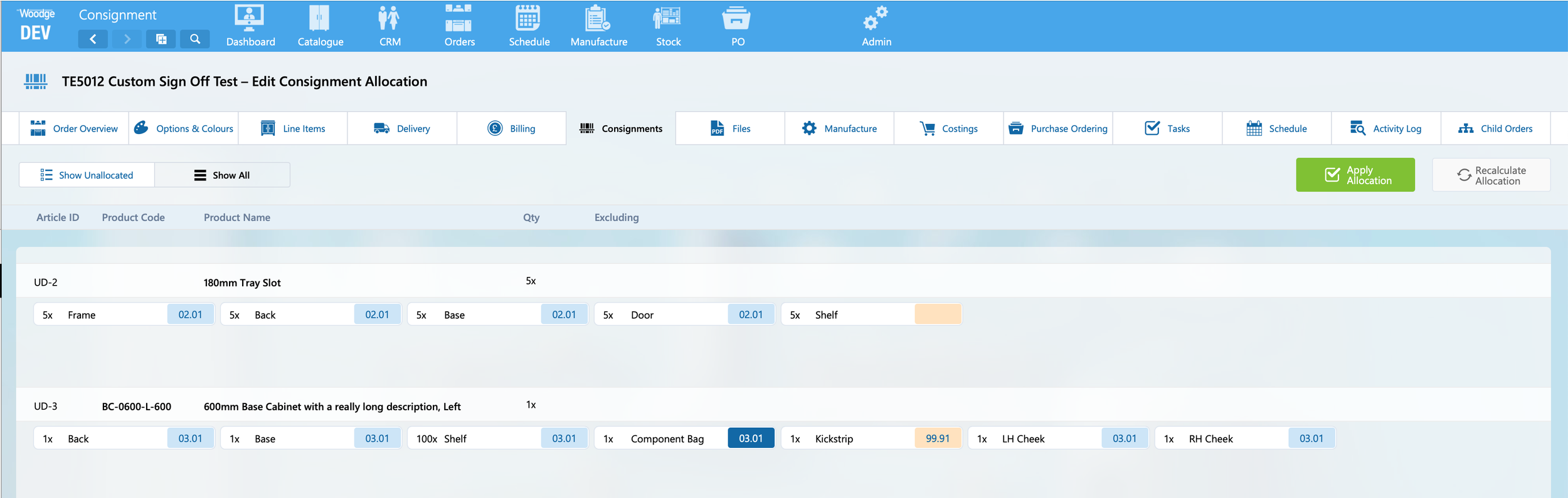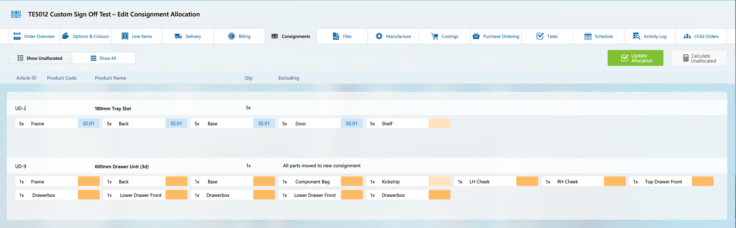 This will calculate the default allocation of these parts. This can be modified as required. Clicking ‘Update Allocation’ will generate or update the consignments.