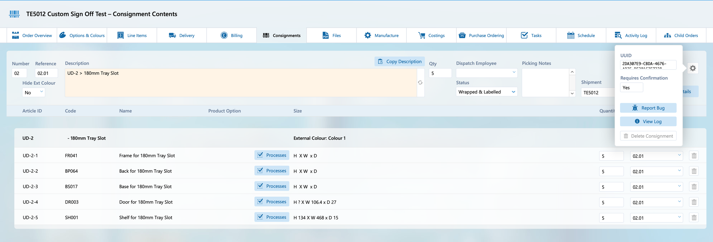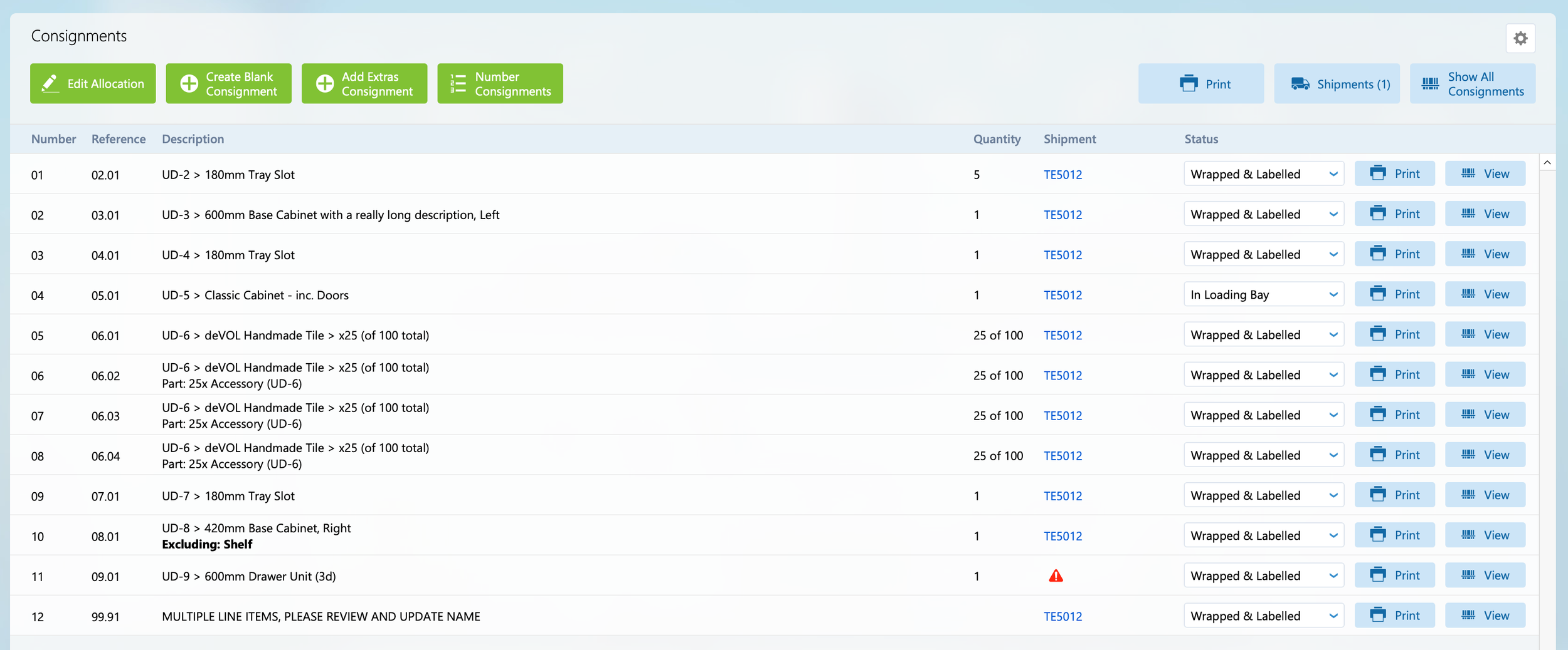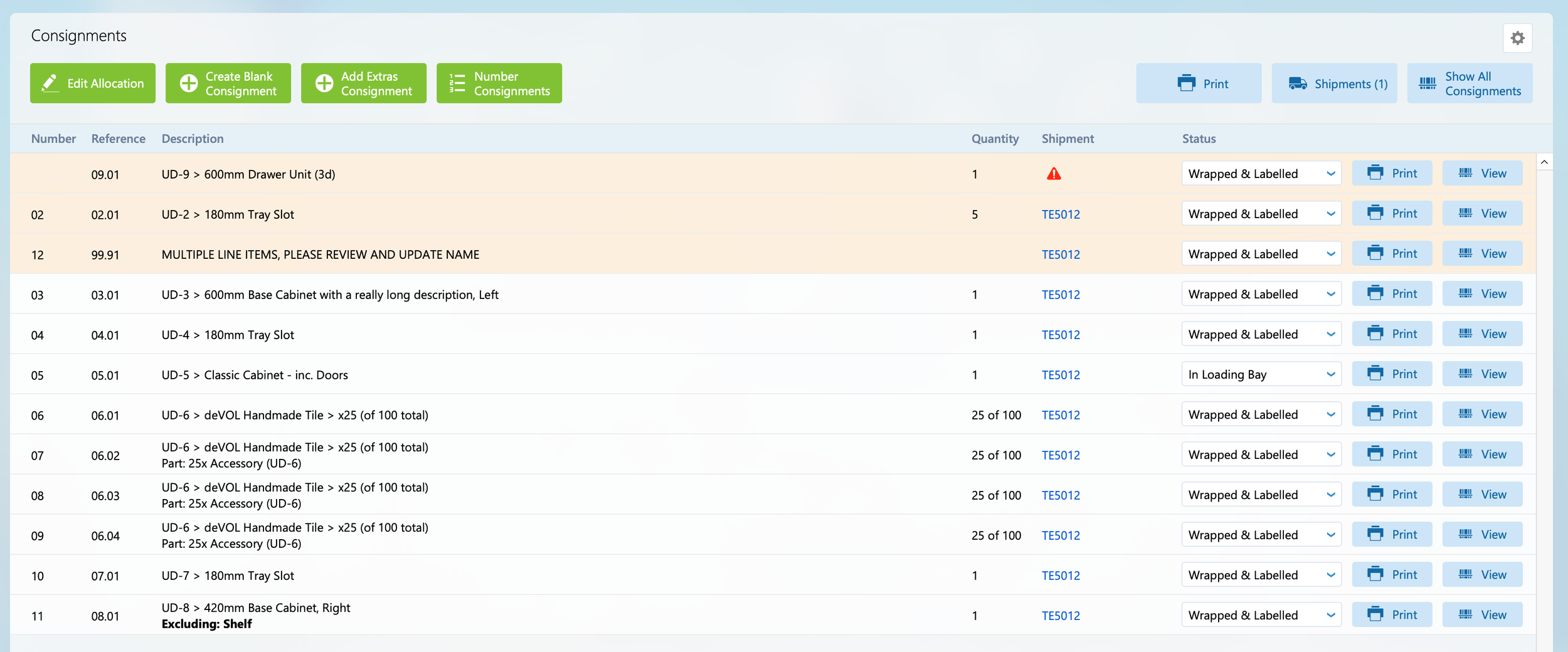 Any new consignments or consignments that have had new parts added to them will be highlighted in orange and shown at the top of the list. These should be checked and have their paperwork or stickers reprinted as required. To edit the consignment click the ‘View’ button.
