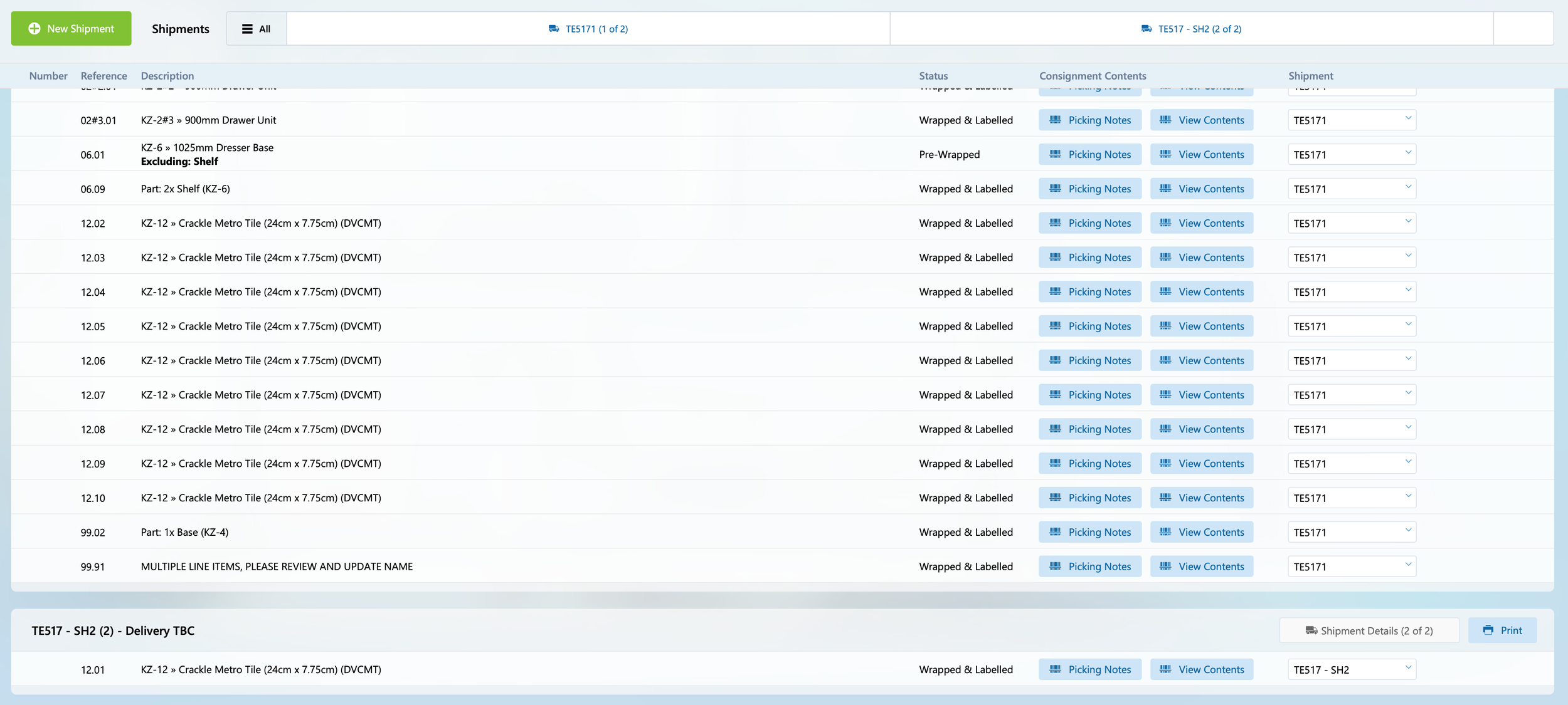After selecting a different shipment the view will update the view to show the consignment in the new shipment. This can be done as many times are required to put the right consignments in each shipment.