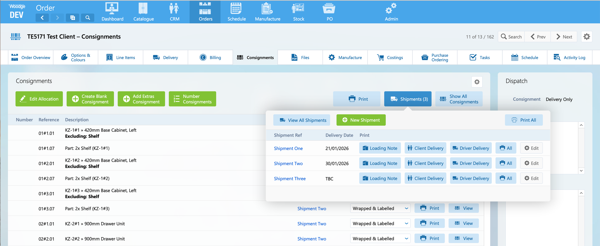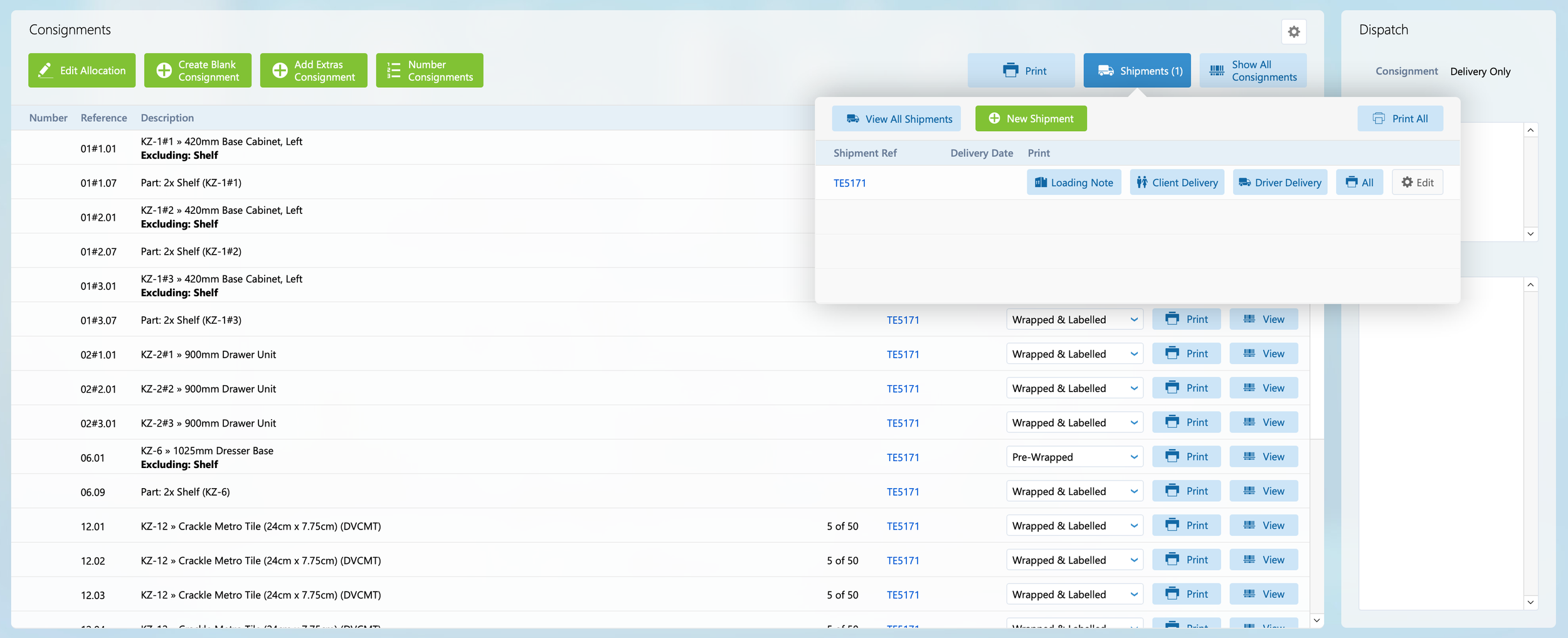 For this layout you can see all the consignments and which shipments they are part of. The button bar at the top allows you to filter between all shipments and individual shipments.