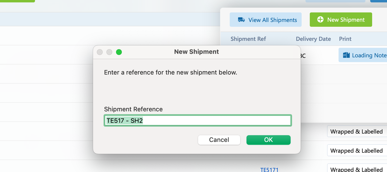 If some parts of the order need to be sent in a different delivery then you can click ‘New Shipment’. You will then be prompted to enter a reference for this new shipment.