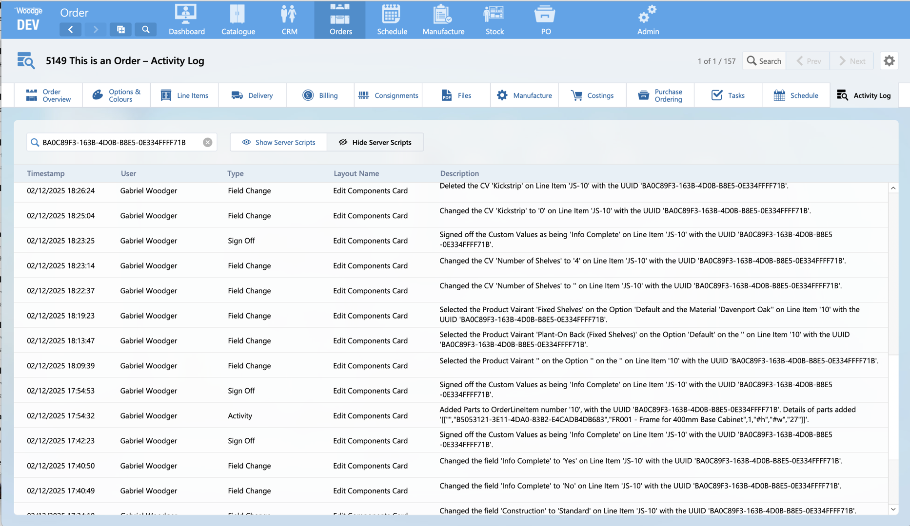 The activity log shows who, when and what change was made to each field. This robust logging makes it clear what modifications have been made and can be very useful in identifying the root cause of issues or unexpected change.