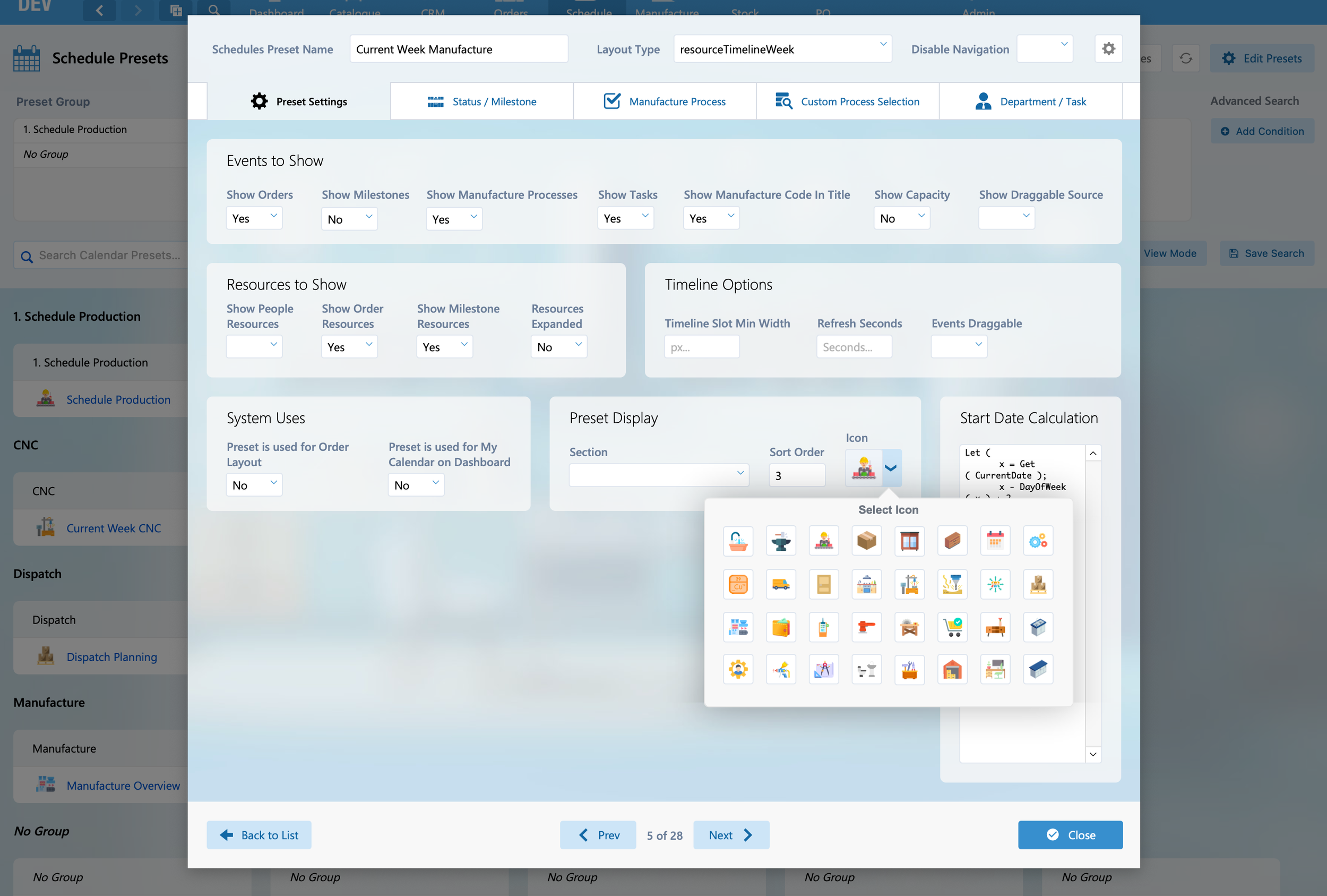 Standard sets of icons are now included in the Woodge system. The new icon pickers make it quick and easy to select an icon from the popover window. You make it easier to identify Calendar Presets from the schedule launcher by picking one of the standard icons.