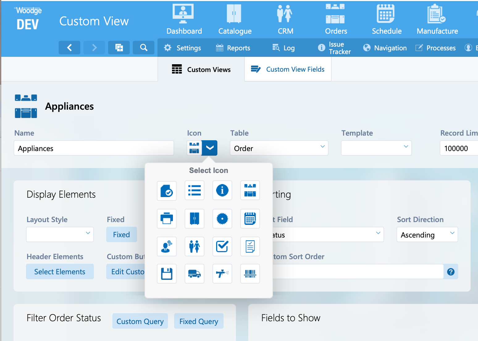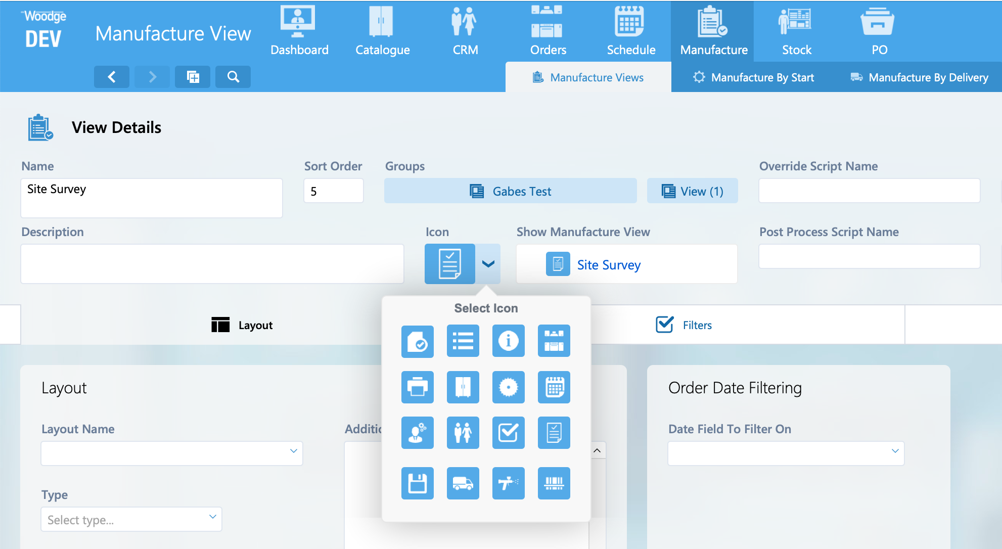 An icon for Manufacture Views and Manufacture View Groups can be selected from the new popover.